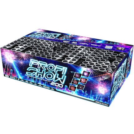 A 208 shot cake with shots firing in a straight and fanned formation.