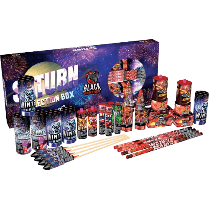 Experience an epic display with the Saturn Selection Box! This 30-piece collection features 8 brilliant fountains, 4 soaring rockets, 4 vibrant roman candles, 1 spinning wheel, 4 shot tubes, 6 spectacular cakes, and 4 powerful mines. A complete fireworks assortment that delivers nonstop color, sparkle, and excitement for a truly out-of-this-world celebration!