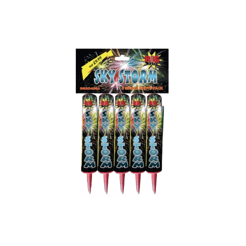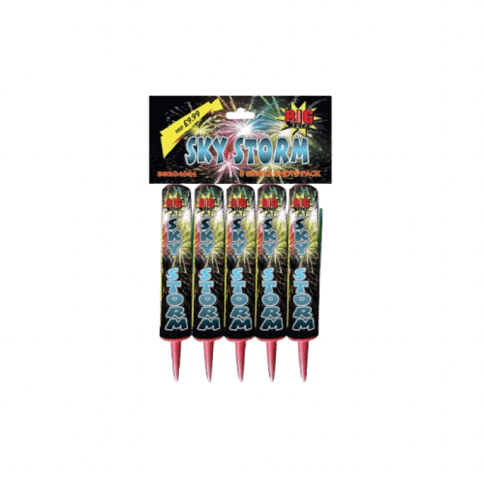 Unleash the power of the storm! Each pack contains 5 single-shot roman candles, firing 20mm bursts with five stunningly different effects. From brilliant colours to crackling finishes, Sky Storm delivers a dynamic display of light and sound that electrifies the night sky. Perfect for adding impact to any fireworks show!