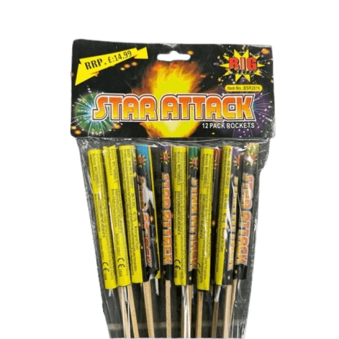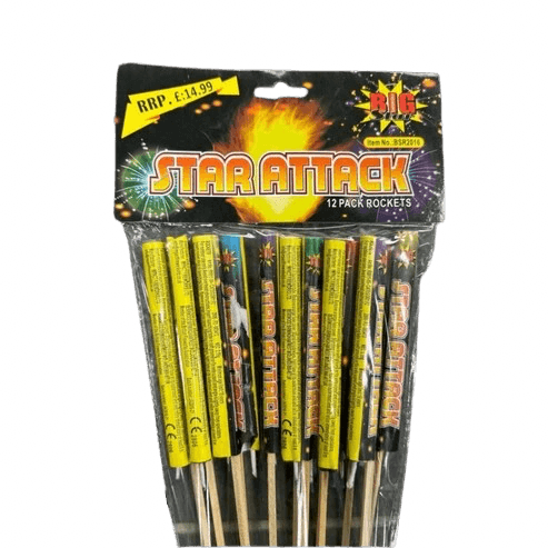 Light up the night sky with explosive brilliance! This premium pack includes 7 rockets, each delivering stunning bursts of colour, sparkle, and sound. Perfect for celebrations and fireworks enthusiasts, Star Attack Rockets guarantee an unforgettable display of power and beauty. Ignite the fuse and let them take your night to new heights!
