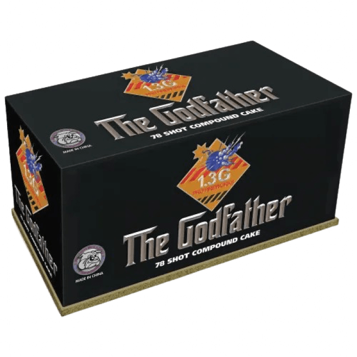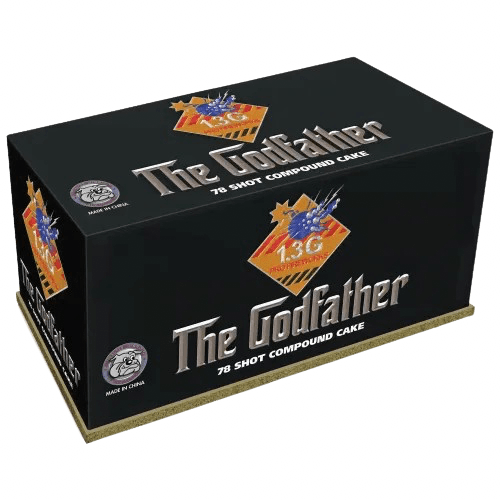 The Godfather 1 36 shot; With following effects; flower crown with green strobe, brocade crown to red to green with white strobe, peach purple star with green strobe, brocade crown to blue with green strobe, titanium gold coconut with blue star & brocade crown with crackling with red star.